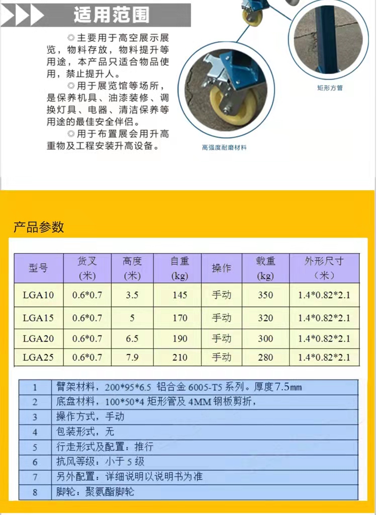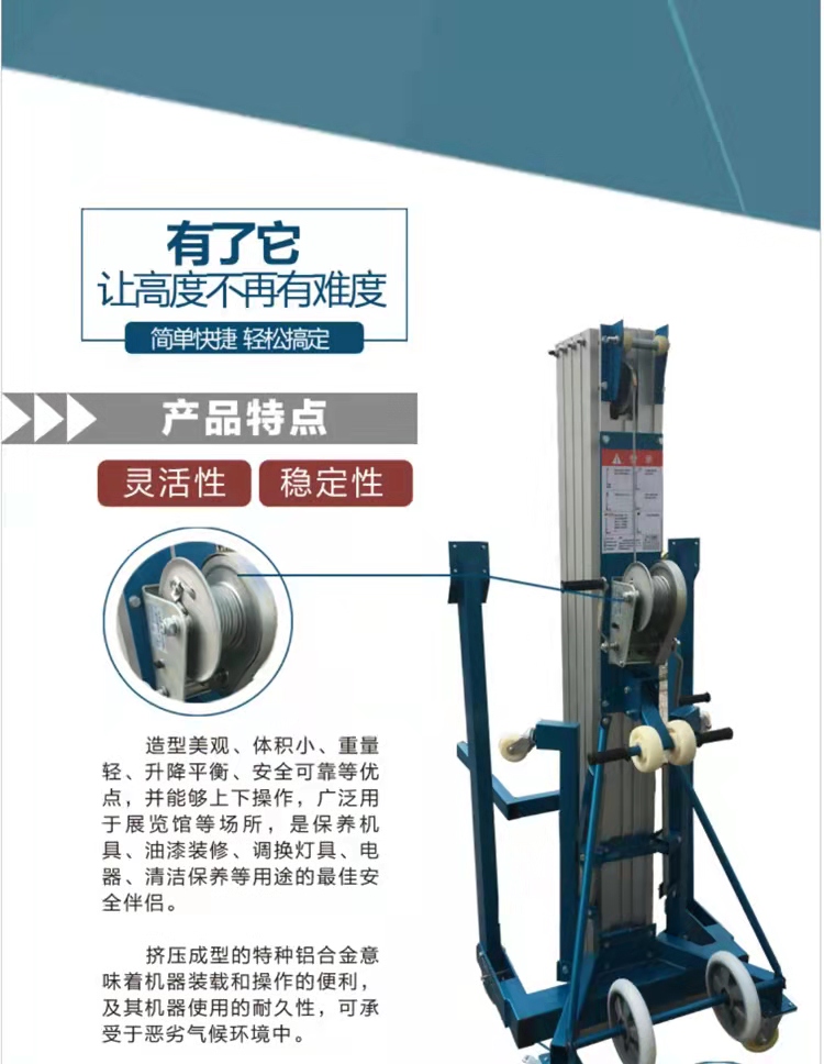 主要用于展览搭建,舞台灯光,音响悬挂,产品宣传展示等等。它可以提高一些高空作业的效率!