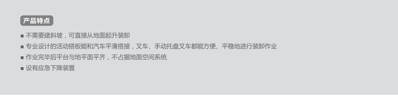 装卸货升降平台 主要用于码头、仓库等装卸场所的货物装卸,与叉车等配套使用,效率更高。该产品承载量大,行程范围广、安全高效是现代化工业文明生产之必备。